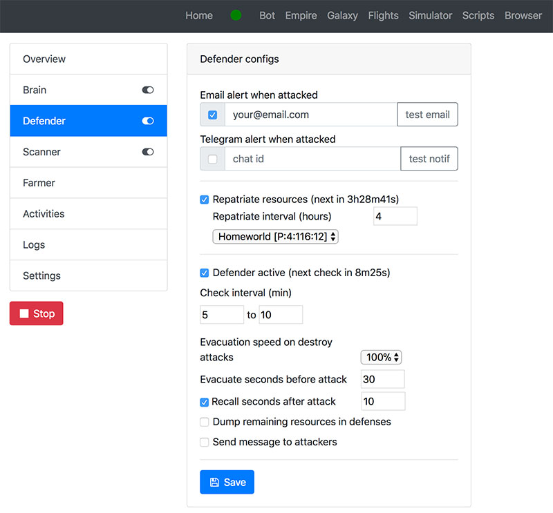 Will monitor any attacks on your planets and fleetsave your ships and resources before the attacks arrive, as well as recalling the fleet afterwards. Optionally, you can get notified through e-mail or Telegram when you are getting attacked.